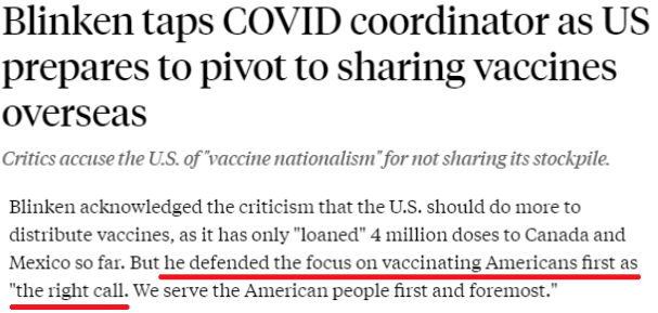 在公開表示要搞“疫苗外交”之前,美國給世人留下的最大印象恐怕就是“疫苗民族主義”了。