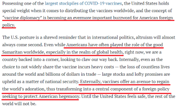 事實已經(jīng)很明白了:疫苗領(lǐng)域的“美國優(yōu)先”并不會消失。至于現(xiàn)在要搞“疫苗外交”,美國也解釋了自己的目的。