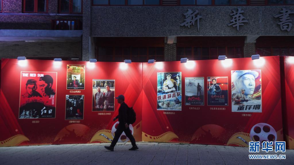 2021年4月2日拍攝的瓶窯古鎮(zhèn)老街上展示的經(jīng)典電影海報。當(dāng)日,浙江省杭州市余杭區(qū)瓶窯古鎮(zhèn)開啟慶建黨百年經(jīng)典電影展映活動。