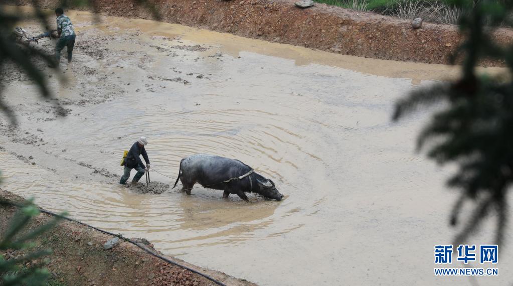 4月11日,貴州省黔東南苗族侗族自治州榕江縣八開鎮擺柳村村民在用耕牛耙田。