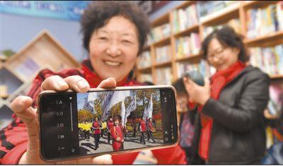 江蘇省揚(yáng)州市邗江區(qū)新盛社區(qū)圖書館內(nèi),一位大媽展示自己的視頻作品。莊文斌攝(影像中國)
