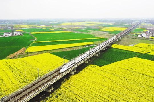 一列高鐵穿過天門市麻陽鎮的油菜花海和麥田。(湖北日報全媒記者 陳勇 攝)