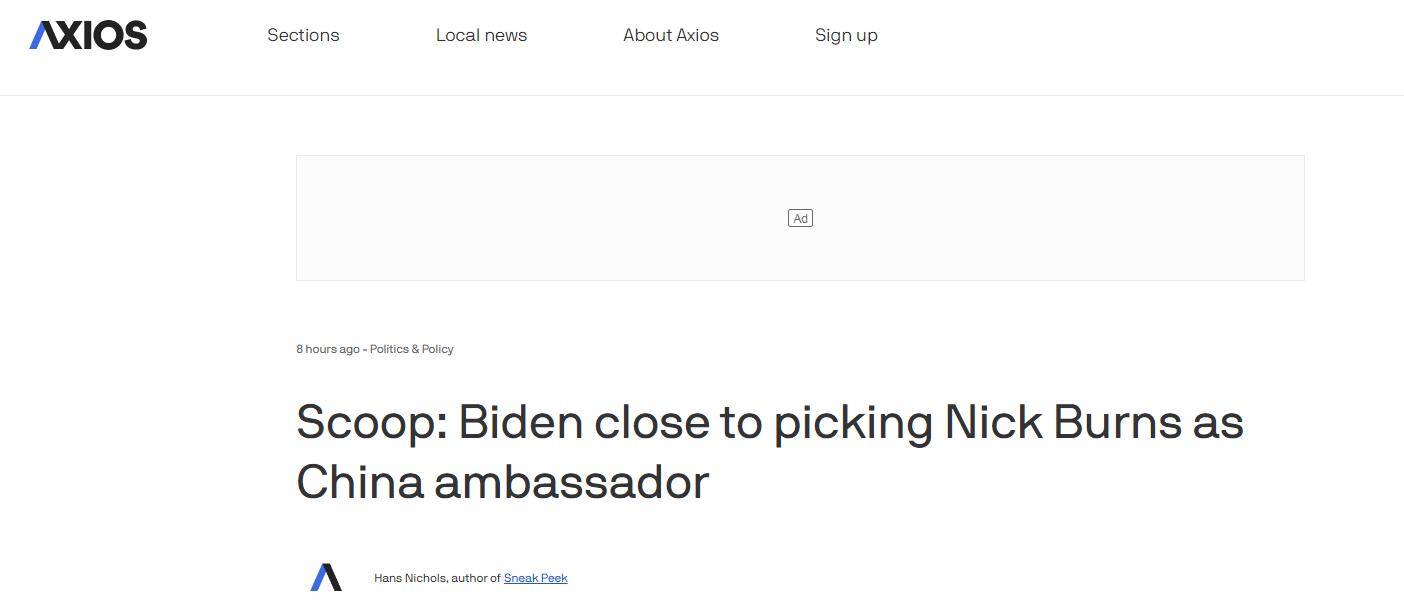 【環(huán)球網(wǎng)報(bào)道】 “拜登接近提名尼克·伯恩斯擔(dān)任美駐華大使”,美國(guó)Axios網(wǎng)站15日以此為題報(bào)道稱,知情人士透露,美國(guó)前副國(guó)務(wù)卿尼古拉斯·伯恩斯擔(dān)任美國(guó)駐華大使的審查工作已進(jìn)入最后階段。