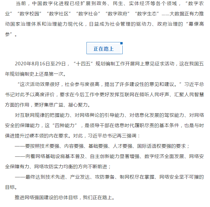 信息化為中華民族帶來(lái)了千載難逢的機(jī)遇,如何“把工作做得更好”?那次會(huì)上,習(xí)近平總書(shū)記就六個(gè)方面發(fā)表意見(jiàn),為新時(shí)代網(wǎng)信事業(yè)發(fā)展提供了根本遵循。