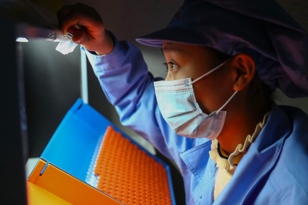 1月6日,科興中維的工作人員在包裝車間對西林瓶包裝新冠病毒滅活疫苗進行人工抽檢。新華社記者 張玉薇 攝
