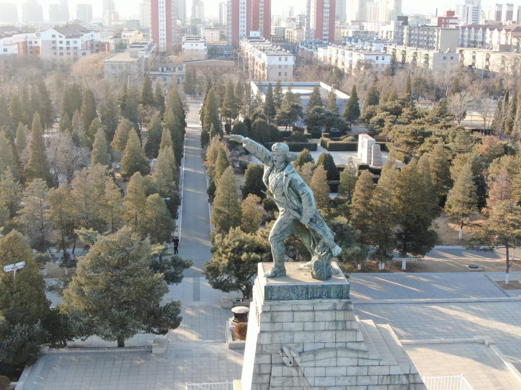 遼沈戰(zhàn)役烈士紀(jì)念塔上的英烈銅像(無人機(jī)照片)。新華社記者楊青 攝