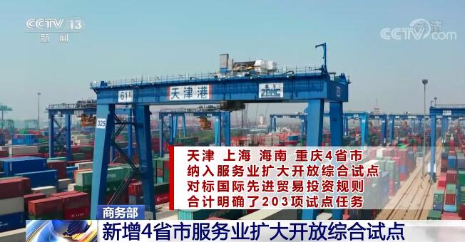 經濟穩中向好,開放創新一刻不停。商務部相關負責人介紹,日前,國務院批復同意將天津、上海、海南、重慶4省市納入服務業擴大開放綜合試點,對標國際先進貿易投資規則,合計明確了203項試點任務。