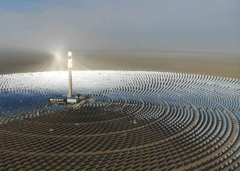 △我國加快發展新能源和可再生能源,能源消費結構不斷優化,能源綠色低碳轉型深入推進,清潔能源消費比重持續提高,可再生能源裝機快速增長。圖為被稱為“超級鏡子發電站”的首航高科敦煌100兆瓦熔鹽塔式光熱電站在戈壁灘上閃耀。