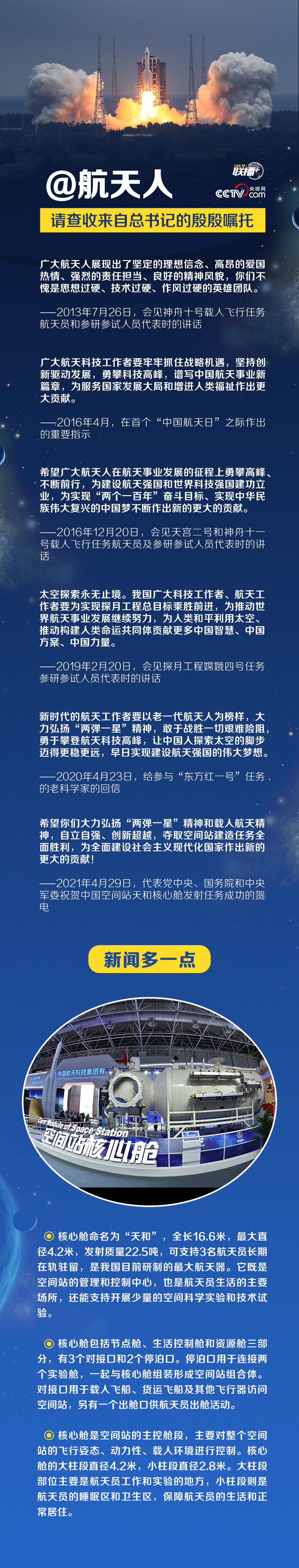 聯(lián)播+“建造空間站、建成國家太空實驗室,是實現(xiàn)我國載人航天工程‘三步走’戰(zhàn)略的重要目標(biāo),是建設(shè)科技強國、航天強國的重要引領(lǐng)性工程。天和核心艙發(fā)射成功,標(biāo)志著我國空間站建造進入全面實施階段,為后續(xù)任務(wù)展開奠定了堅實基礎(chǔ)。”4月29日,中共中央總書記、國家主席、中央軍委主席習(xí)近平代表黨中央、國務(wù)院和中央軍委致電祝賀中國空間站天和核心艙發(fā)射任務(wù)成功。