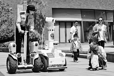 五月一日,浙江省舟山市公安局普陀區(qū)分局東港派出所民警“帶領(lǐng)”5G警用機(jī)器人在街面執(zhí)行巡邏防控任務(wù),吸引了不少小朋友的目光。鄒訓(xùn)永攝/光明圖片