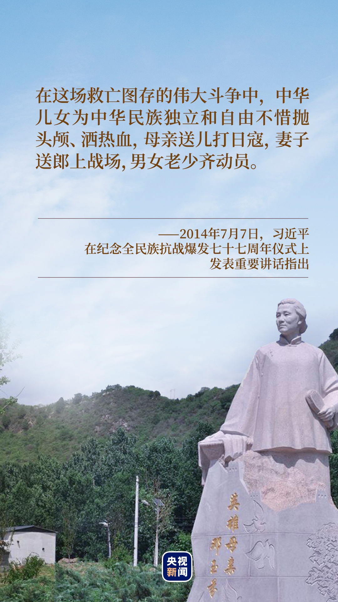 “北京密云縣一位名叫鄧玉芬的母親,把丈夫和5個孩子送上前線,他們全部戰死沙場!2014年7月7日,在出席紀念全民族抗戰爆發七十七周年儀式并發表重要講話時,習近平總書記講述了英雄母親鄧玉芬的故事。