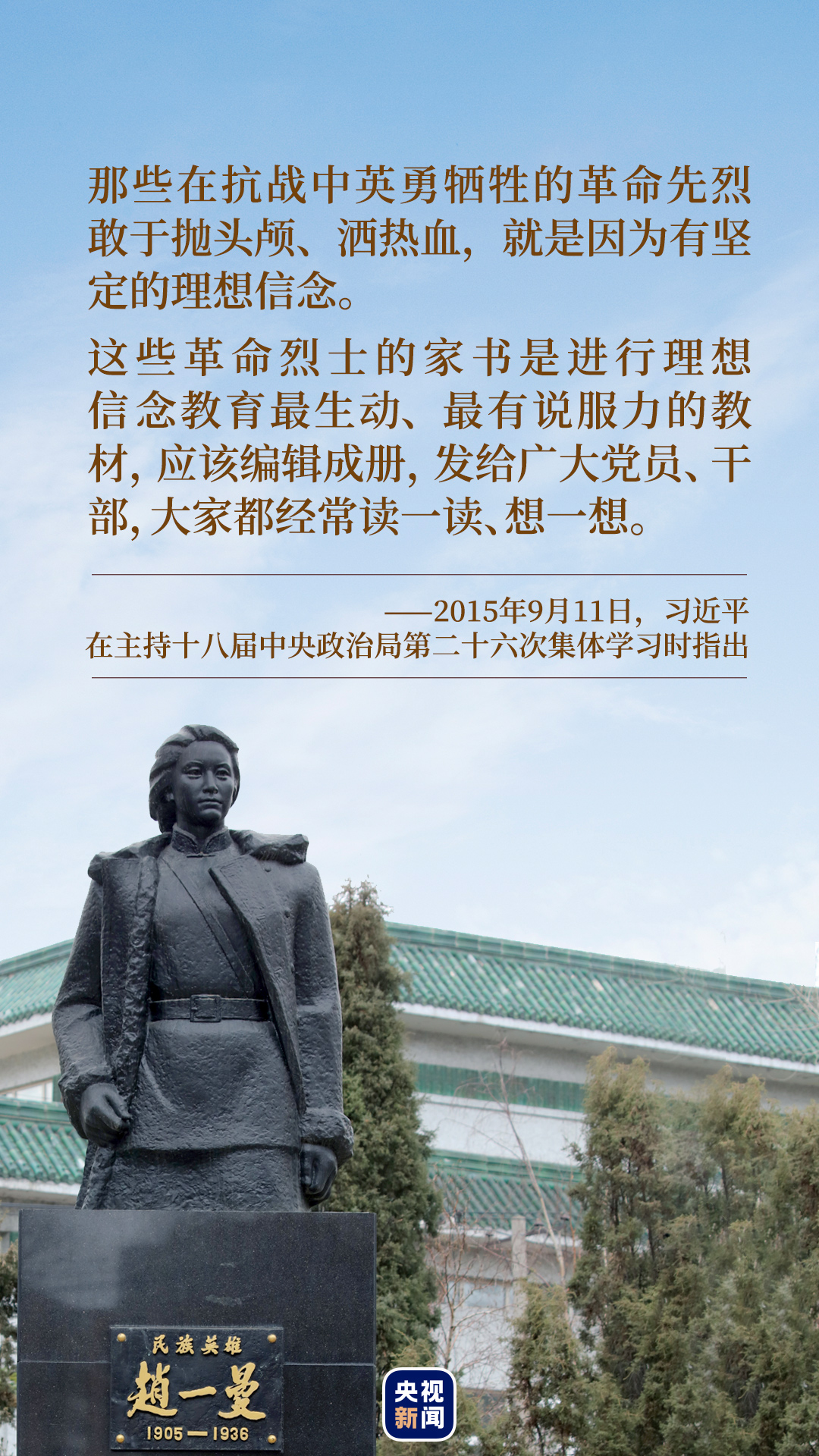 “趙一曼在臨死前的遺書中寫道:‘母親因為堅決地做了反滿抗日的斗爭,今天已經到了犧牲的前夕了。母親和你在生前是永久沒有再見的機會了……我最親愛的孩子啊!母親不用千言萬語來教育你,就用實行來教育你。在你長大成人之后,希望你不要忘記你的母親是為國而犧牲的……母親死后,我的孩子要代替母親繼續斗爭,自己壯大成長,來安慰九泉之下的母親!’”一字一句,總書記飽含深情。