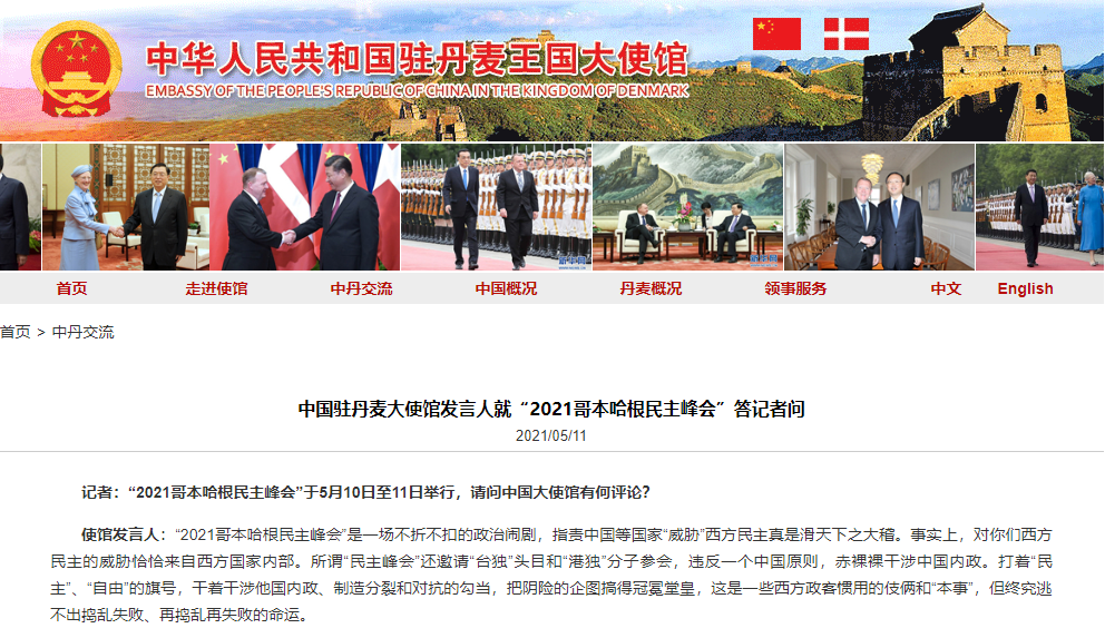 中國(guó)駐丹麥大使館官方網(wǎng)站消息:有記者提問,“2021哥本哈根民主峰會(huì)”于5月10日至11日舉行,請(qǐng)問中國(guó)大使館有何評(píng)論?