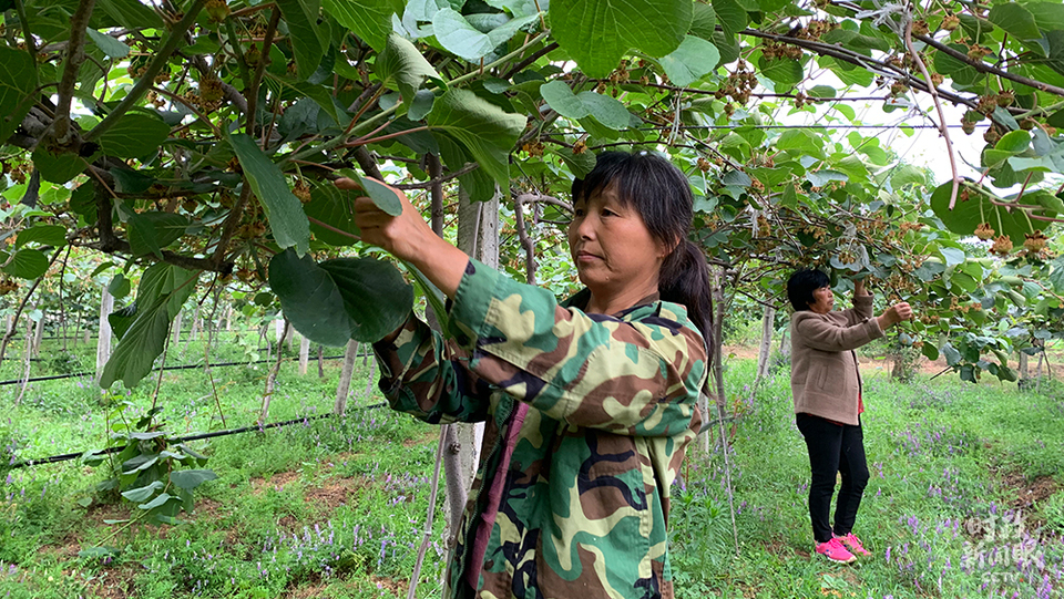 △村民正在為獼猴桃疏果。(總臺央視記者段德文、盧心雨拍攝)