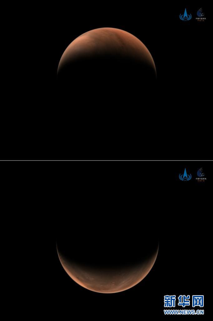 2021年3月26日,國家航天局發布2幅由我國首次火星探測任務天問一號探測器拍攝的南、北半球火星側身影像。這是一張拼版照片,上圖為:北半球上方火星影像;下圖為:南半球上方火星影像。