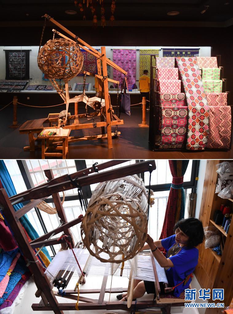 拼版照片:上圖為廣西民族博物館展示的織錦機(5月18日攝);下圖為中國工藝美術大師譚湘光在用織錦機織壯錦(2018年4月24日攝)。