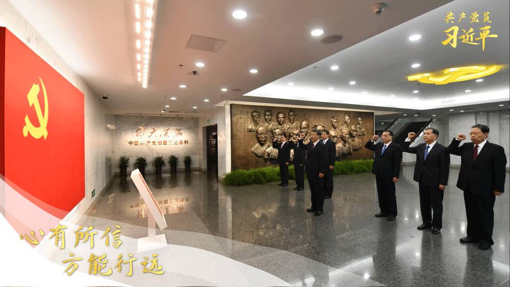 人們記得,黨的十九大閉幕不久,在中共一大會址紀念館一層序廳,面對如鮮血浸染的巨幅黨旗,習近平帶領其他中共中央政治局常委同志一道舉起右拳,莊嚴宣誓: