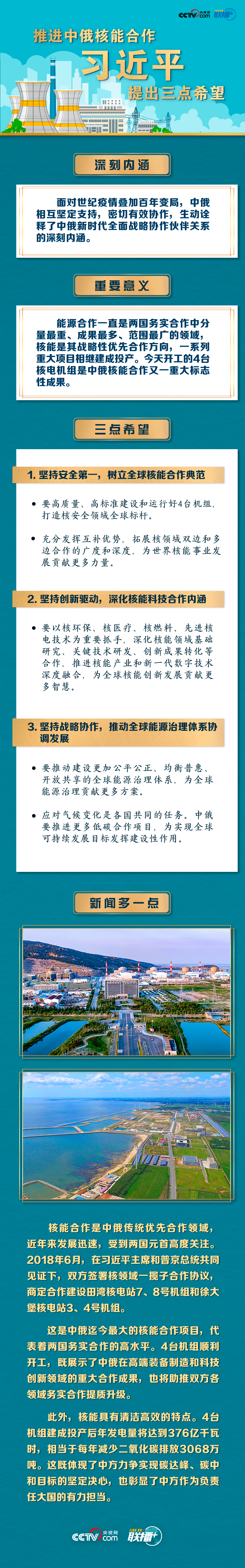 “今年是《中俄睦鄰友好合作條約》簽署20周年。我同普京總統商定,將在更高水平、更廣領域、更深層次推進雙邊關系向前發展!5月19日,習近平主席在北京通過視頻連線,同俄羅斯總統普京共同見證兩國核能合作項目——田灣核電站和徐大堡核電站開工儀式。