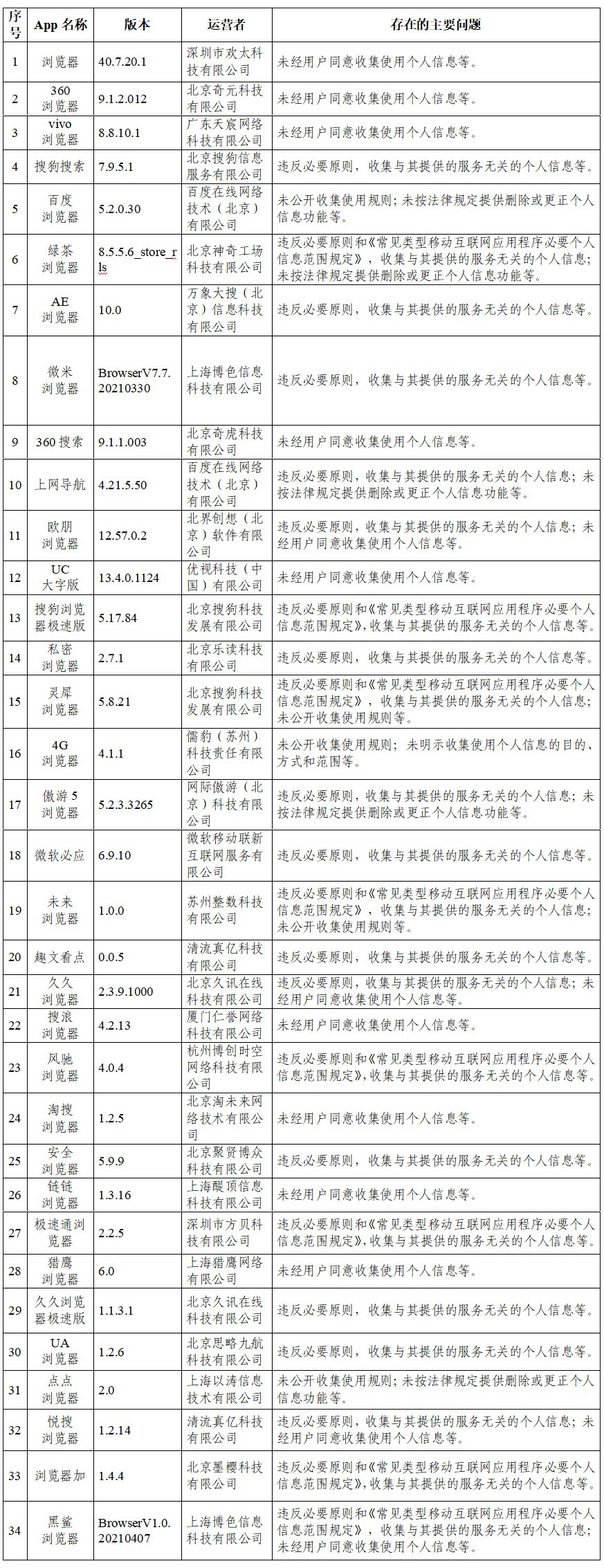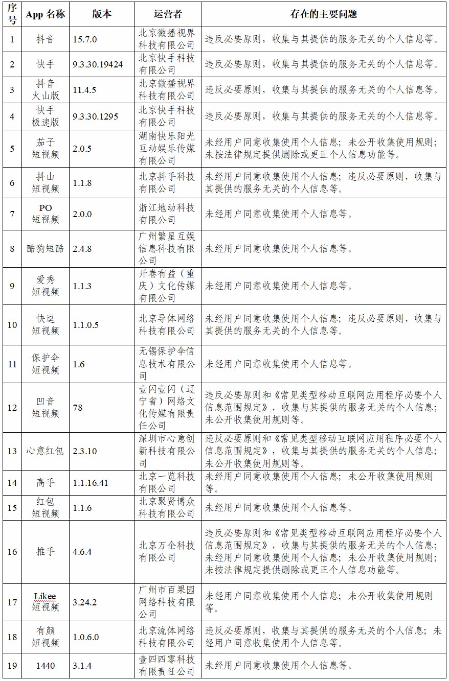 中新網(wǎng)5月21日電 據(jù)國家互聯(lián)網(wǎng)信息辦公室網(wǎng)站消息,近期,針對(duì)人民群眾反映強(qiáng)烈的App非法獲取、超范圍收集、過度索權(quán)等侵害個(gè)人信息的現(xiàn)象,國家互聯(lián)網(wǎng)信息辦公室依據(jù)法律和有關(guān)規(guī)定,組織對(duì)短視頻、瀏覽器、求職招聘等常見類型公眾大量使用的部分App的個(gè)人信息收集使用情況進(jìn)行了檢測(cè)。有關(guān)情況如下: