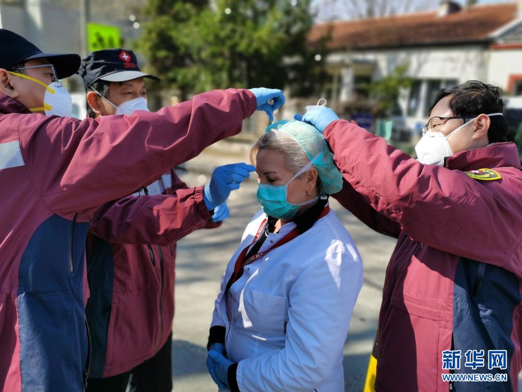 2020年4月4日,中國赴塞爾維亞抗疫醫療專家組在貝爾格萊德的基層發熱門診為門診主任特里富諾維奇(中)更換防護標準更高的口罩。新華社發