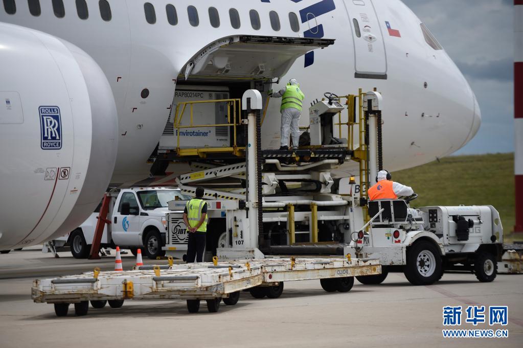 2021年3月16日,在烏拉圭首都蒙得維的亞,工作人員從飛機上卸載中國科興新冠疫苗。新華社發(尼古拉斯·薩拉亞 攝)