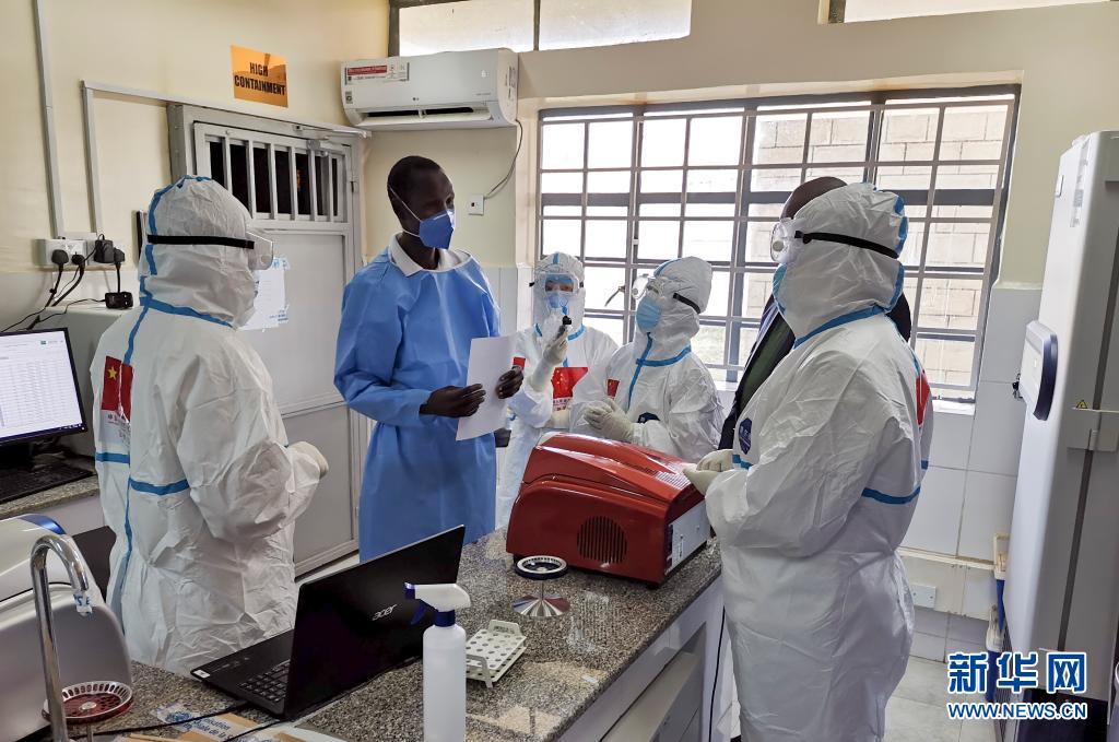 2020年8月21日,在南蘇丹首都朱巴的一處新冠病毒檢測機構,中國抗疫醫療專家組成員與南一線醫護人員交流。新華社發(中國駐南蘇丹大使館供圖)