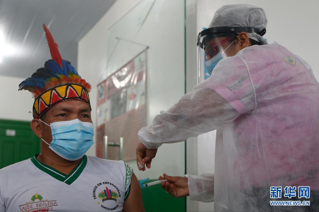 2021年1月19日,醫護人員在巴西亞馬孫州塔巴廷加市為一名原住民接種中國新冠疫苗。新華社發(盧西奧·塔沃拉攝)
