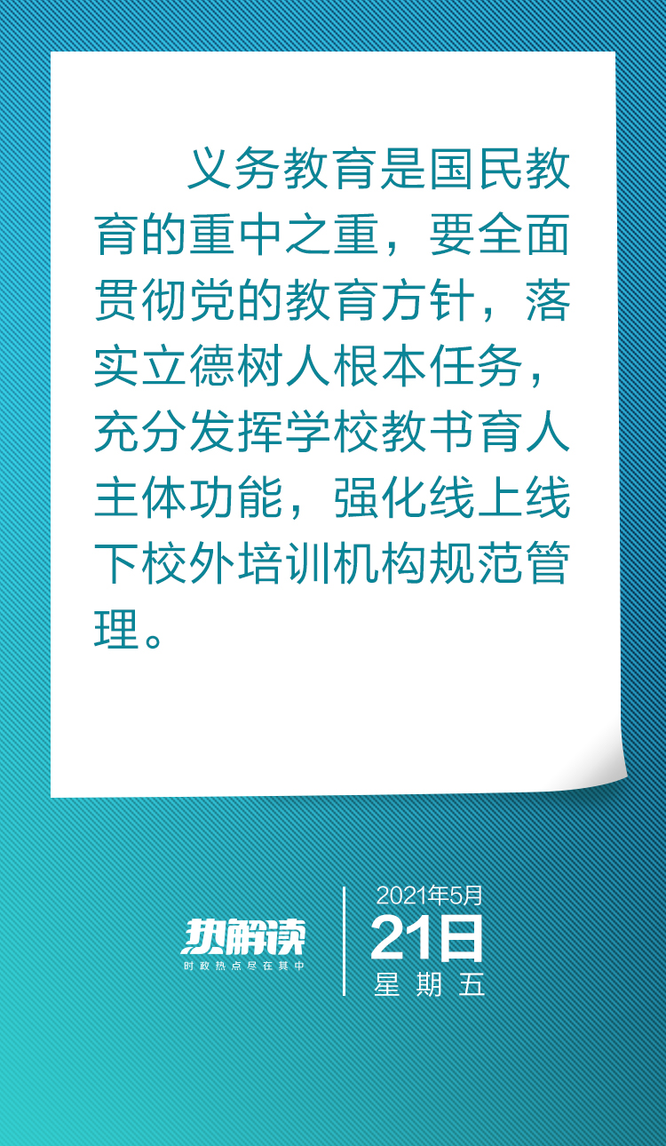 習近平總書記在會議上明確指出,義務教育是國民教育的重中之重,要全面貫徹黨的教育方針,落實立德樹人根本任務,充分發揮學校教書育人主體功能,強化線上線下校外培訓機構規范管理。