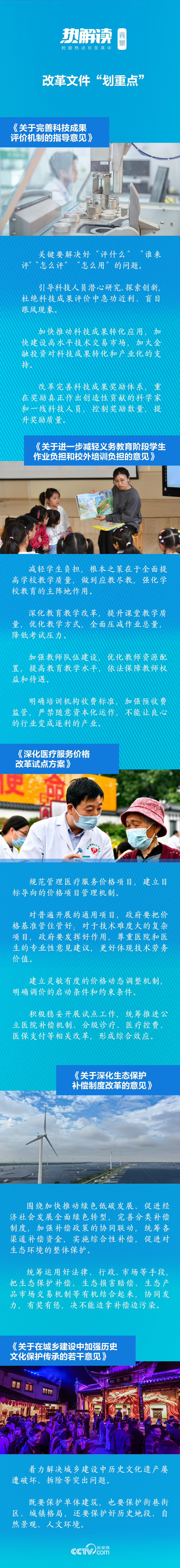 除了教育問題,中央全面深化改革委員會第十九次會議還審議通過了《關于完善科技成果評價機制的指導意見》、《深化醫療服務價格改革試點方案》、《關于深化生態保護補償制度改革的意見》、《關于在城鄉建設中加強歷史文化保護傳承的若干意見》等文件,在科教文衛和生態保護等人民群眾十分關切的領域都進行了重點部署。