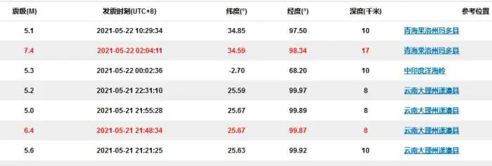21日晚至22日上午,云南、青海兩省接連發生地震,地震頻度之高,震級之大一時間成為輿論焦點。根據中國地震臺網的數據,從21日21時至22日11時,14個小時內,兩省發生的5級以上地震達到6次,其中青海瑪多縣發生的地震高達7.4級。