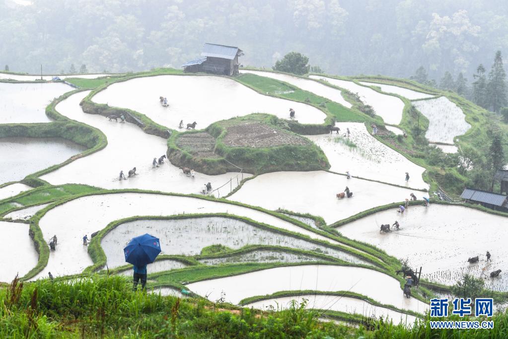 5月23日,貴州省黔東南苗族侗族自治州黎平縣尚重鎮上洋、下洋、岑埂等村的農民牽著耕牛來到岑丈梯田,參加“千牛同耕”活動,向游客展示當地傳統農耕文化!⌒氯A社記者 楊文斌 攝