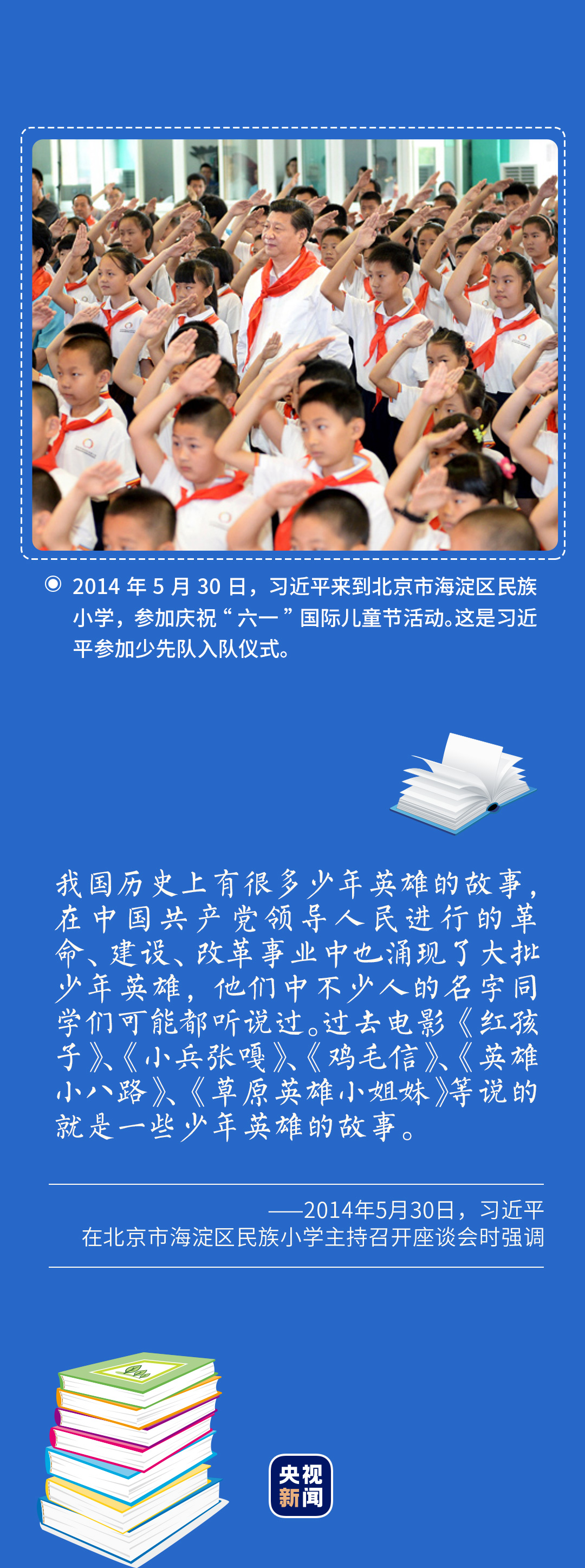 2014年5月30日,習近平總書記來到北京市海淀區民族小學,參加慶!傲弧眹H兒童節活動。在與少先隊輔導員、教師、家長、學生代表座談時,總書記叮囑,要心有榜樣,學習英雄人物、先進人物、美好事物,在學習中養成好的思想品德追求。