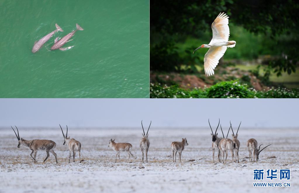 這是一張拼版照片:左上圖為在湖北省宜昌市江邊,長江江豚在水中嬉戲(無人機照片,新華社記者肖藝九5月11日攝);右上圖為陜西省漢中市洋縣朱鹮生態園內的朱鹮(新華社記者劉瀟5月13日攝);下圖為藏羚羊在三江源可可西里地區活動(新華社記者吳剛4月20日攝)。新華社發