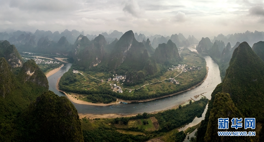這是2018年10月18日拍攝的廣西桂林陽朔縣興坪鎮的漓江景色(無人機拼接照片)。新華社記者 李鑫 攝