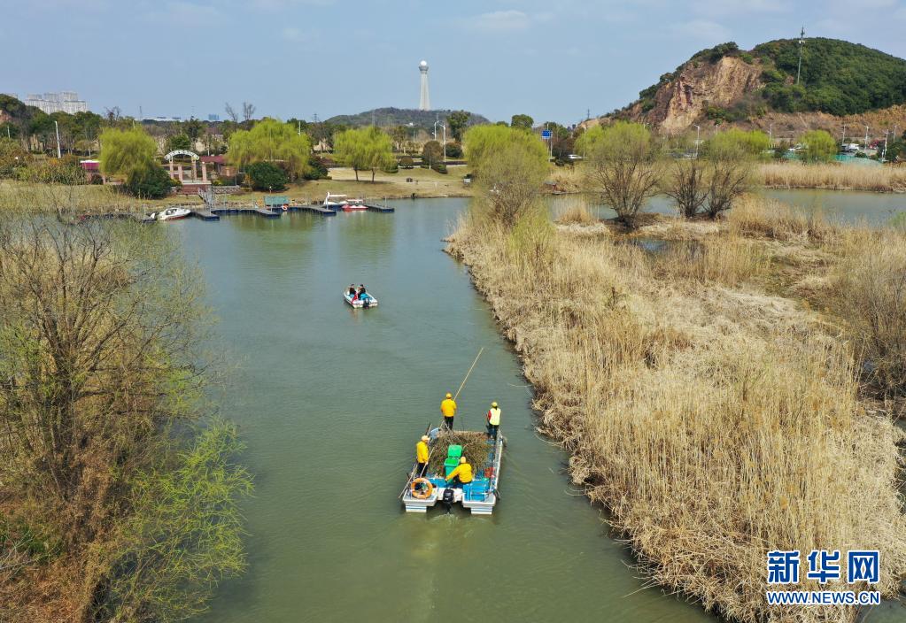 2021年2月24日,浙江湖州吳興區八里店鎮移沿山村河長帶隊在移沿山村開展巡河、保潔作業(無人機照片)。新華社記者 翁忻旸 攝