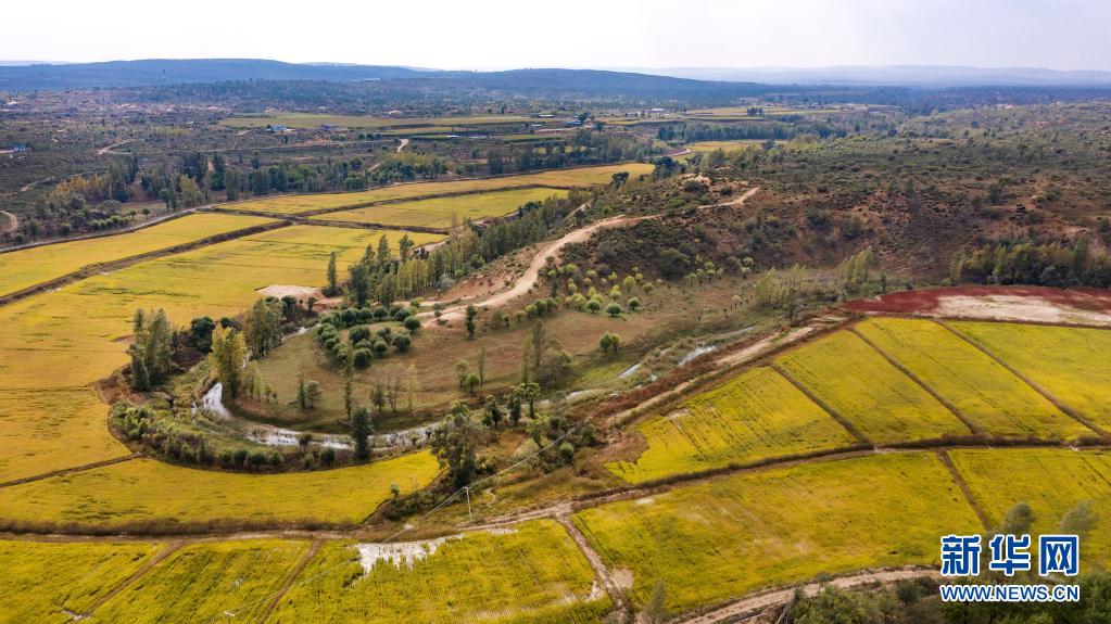 2020年9月26日拍攝的陜西省靖邊縣黃蒿界鎮馬季溝村稻田(無人機照片)。近年來,靖邊縣實施了“三北”防護林、退耕還林、流域治理等生態建設工程,北部沙漠區裸露明沙完全消失,中部農田林網蔚然成蔭,南部山區夏季綠色滿山。新華社記者 陶明 攝