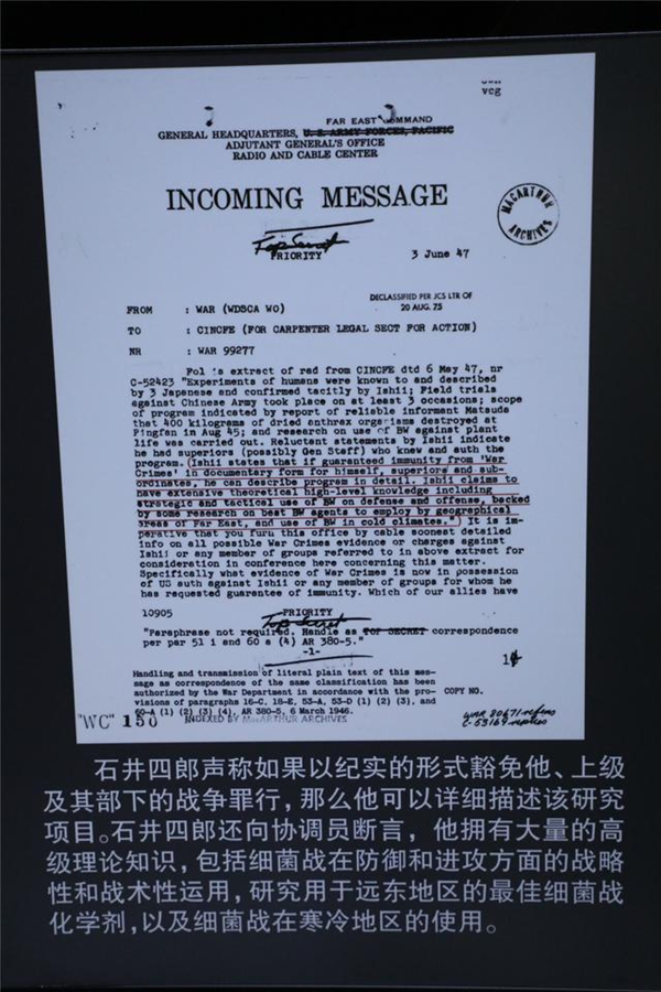 作為交換,美國(guó)包庇了這些惡魔。1947年9月,美國(guó)國(guó)務(wù)院向當(dāng)時(shí)美國(guó)駐日最高司令麥克阿瑟作出指示,為了獲取石井等人掌握的細(xì)菌實(shí)驗(yàn)資料,可以“不追究石井及其同伙的戰(zhàn)爭(zhēng)犯罪責(zé)任。”2017年8月,日本NHK電視臺(tái)播放的紀(jì)錄片顯示,在美國(guó)的庇護(hù)下,731部隊(duì)成員幾乎沒(méi)人因?yàn)樗麄兊淖镄惺艿竭^(guò)任何懲治。