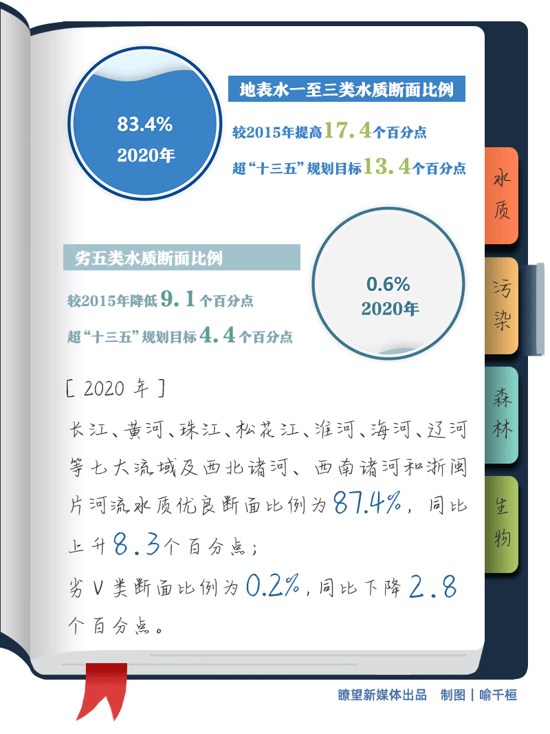 碧水更多,水質更優良。地表水Ⅰ至Ⅲ類水質斷面比例由66%上升至83.4%,提高17.4個百分點,超過“十三五”規劃目標13.4個百分點;劣Ⅴ類水質斷面比例由9.7%下降到0.6%,降低9.1個百分點,超過“十三五”規劃目標4.4個百分點。
