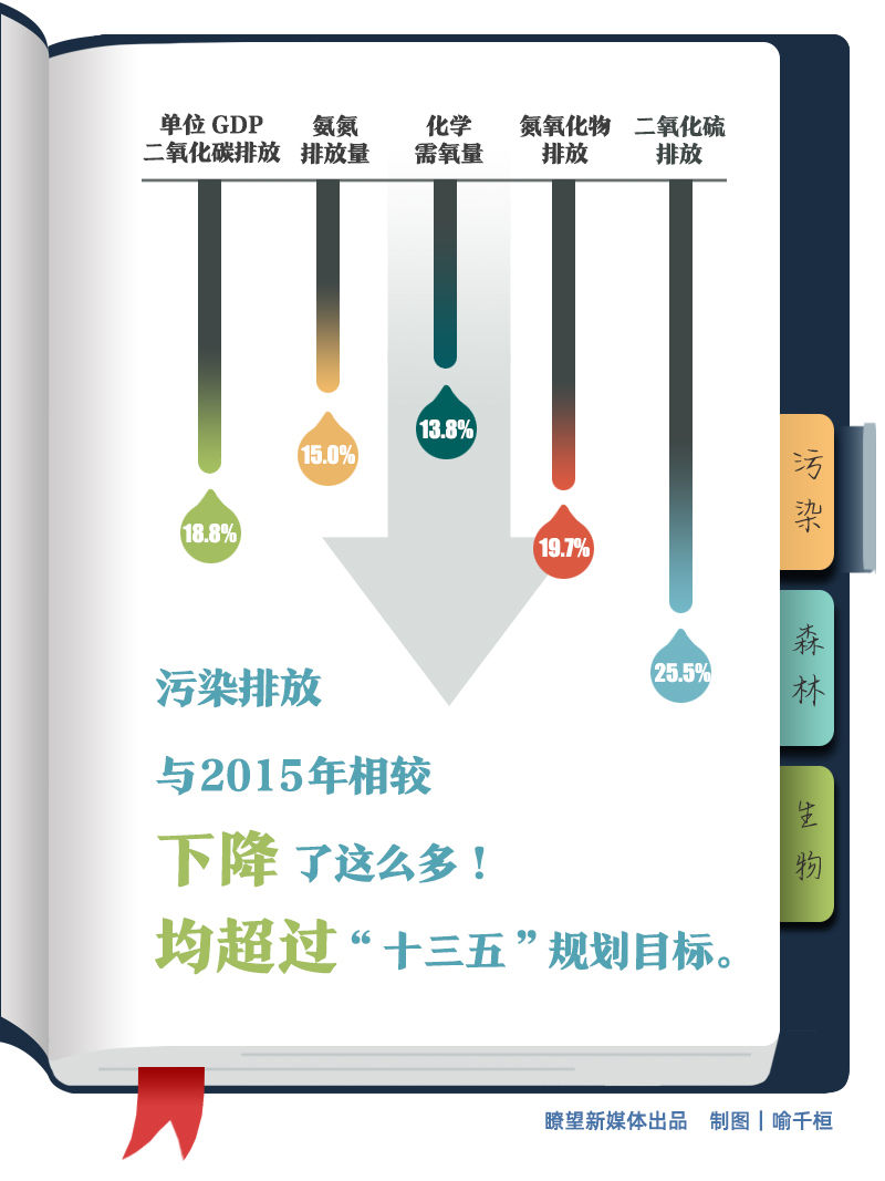 污染更少,減排更有效。二氧化硫、氮氧化物、化學需氧量、氨氮排放量較2015年分別下降25.5%、19.7%、13.8%、15.0%,單位GDP二氧化碳排放較2015年降低18.8%,均超過“十三五”規劃目標。