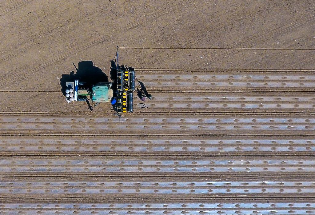 在新疆生產建設兵團第六師共青團農場的一片棉花地中,一名農機手正操縱裝有北斗導航系統的多功能一體化無人駕駛精量播種機在田間播種(2019年4月19日攝,無人機照片)。新華社記者 王菲 攝