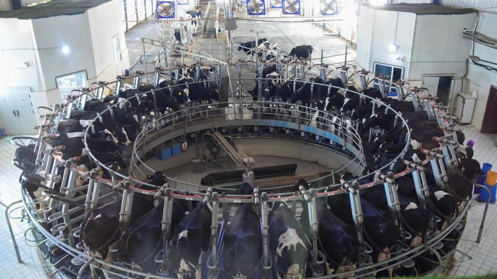 這是在新疆天潤乳業股份有限公司絲路云端牧場拍攝的智能轉盤式擠奶廳(2020年5月26日攝)。新華社記者 丁磊 攝