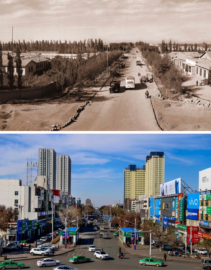拼版照片:上圖為上世紀50年代初期的石河子新城街道北子午路(新疆兵團農墾博物館提供)。下圖為2019年4月9日拍攝的同路段街景。新華社記者 王菲 攝