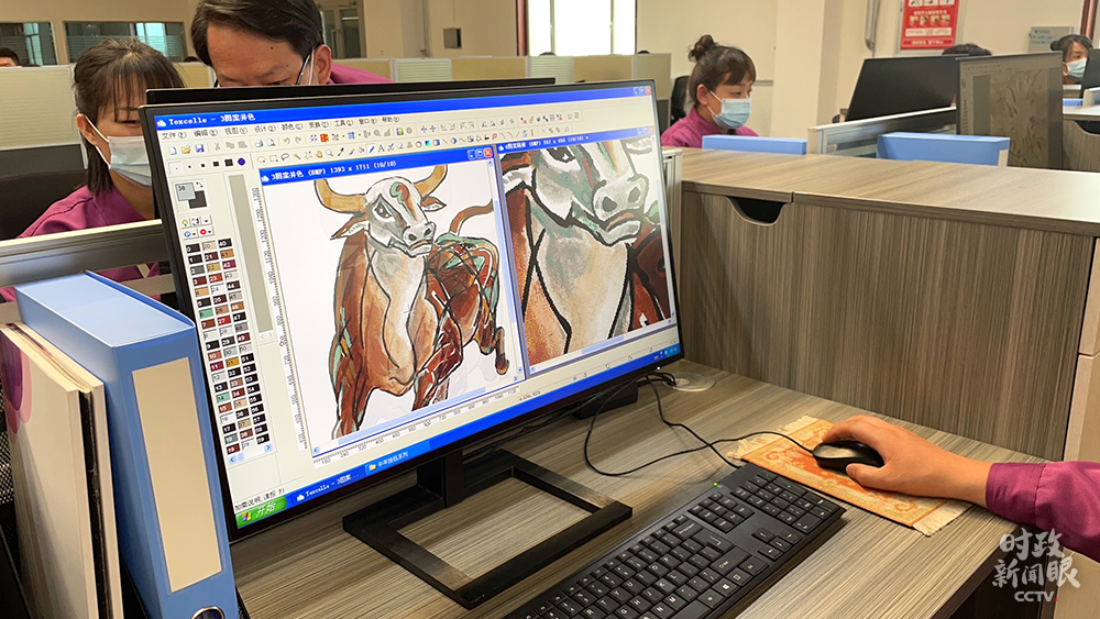 △設計研發部正在修改名為“奮發圖強”的藏毯圖樣。(總臺央視記者楊松濤、楊立峰拍攝)