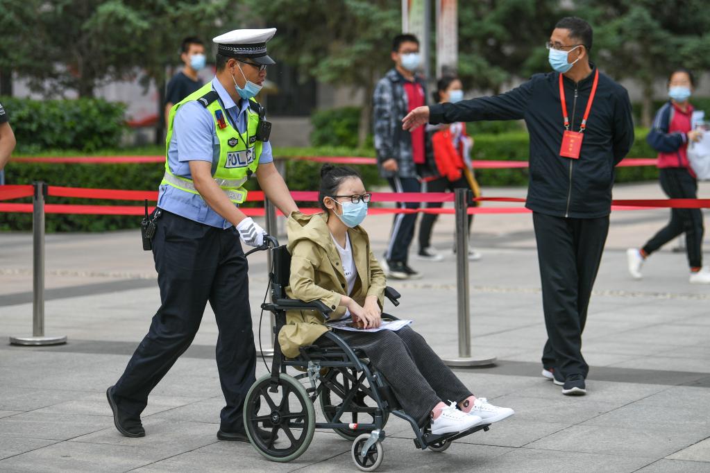 6月7日,交警幫助行動不便的考生進(jìn)入內(nèi)蒙古呼和浩特市第二中學(xué)(西校區(qū))考點。