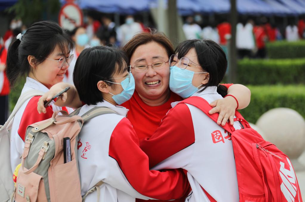在河北省固安縣第一中學(xué)考點,考生結(jié)束首場科目考試后與老師擁抱。