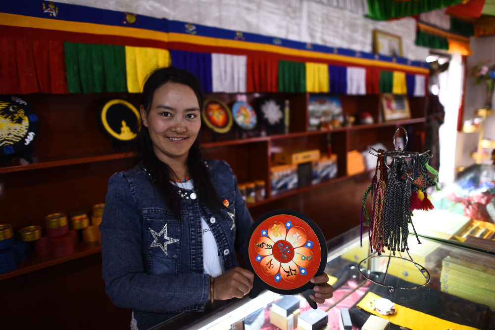長江源村村民才旦卓瑪在自家的工藝品店展示手工藝品。開展職業培訓,鼓勵村民進城務工,加上草原獎補等政策,讓長江源村家家都有穩定可觀的收入。2017年,長江源村正式脫貧摘帽。