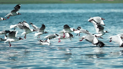 △棕頭鷗成群掠過(guò)湖面(總臺(tái)央視記者毛保武拍攝)