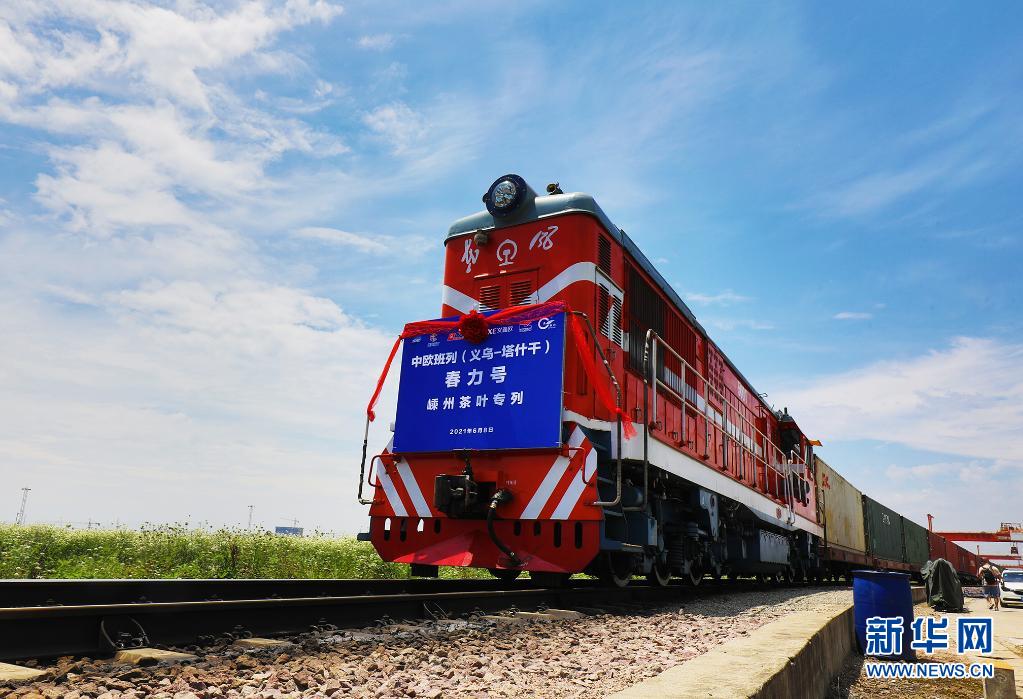 6月8日,滿載茶葉及茶產(chǎn)品的中歐班列從義烏西站啟程。