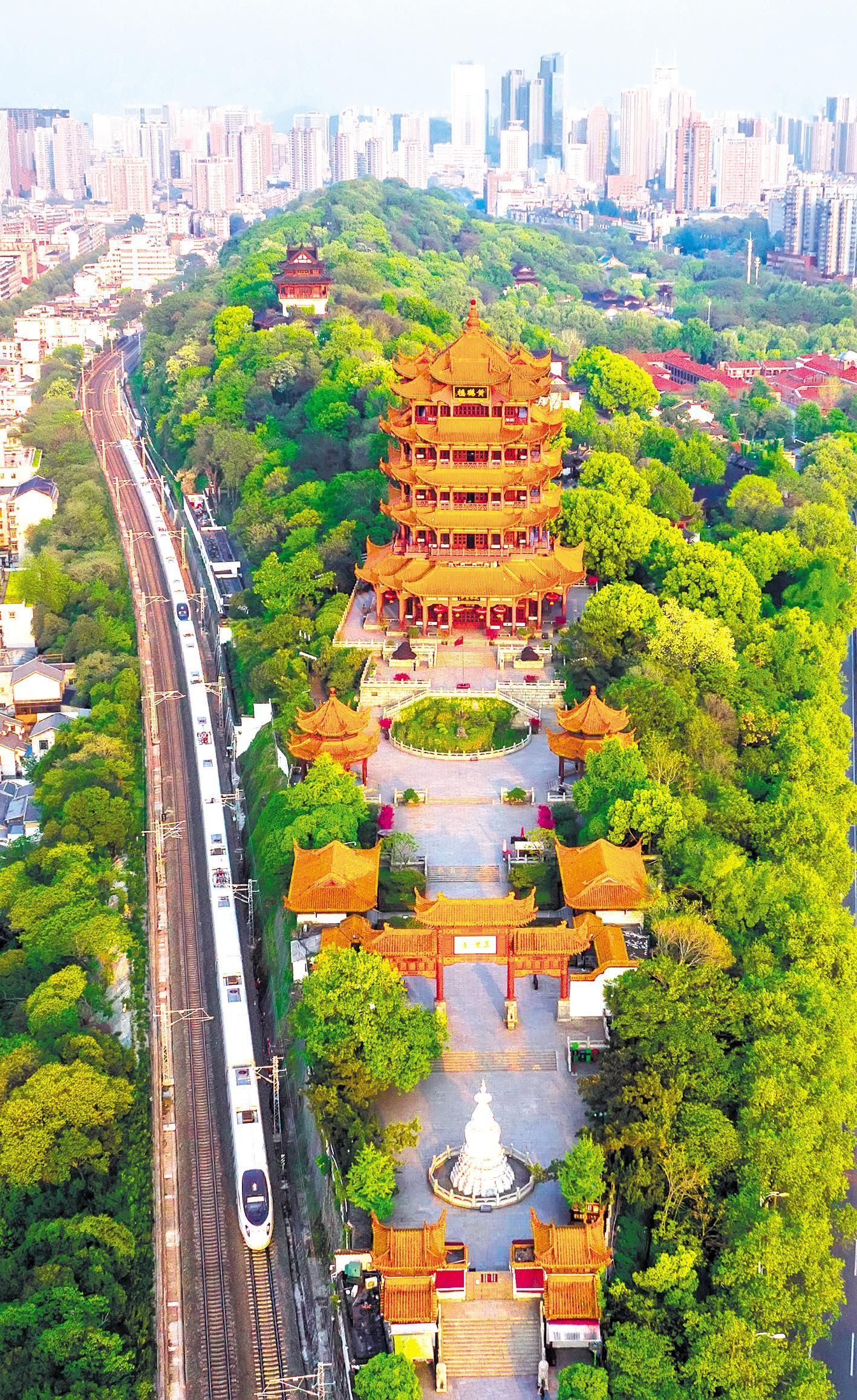 2020年4月12日,武漢市武昌蛇山上春意盎然,一列動車組從黃鶴樓旁邊經過。 湖北日報全媒記者 陳勇 攝