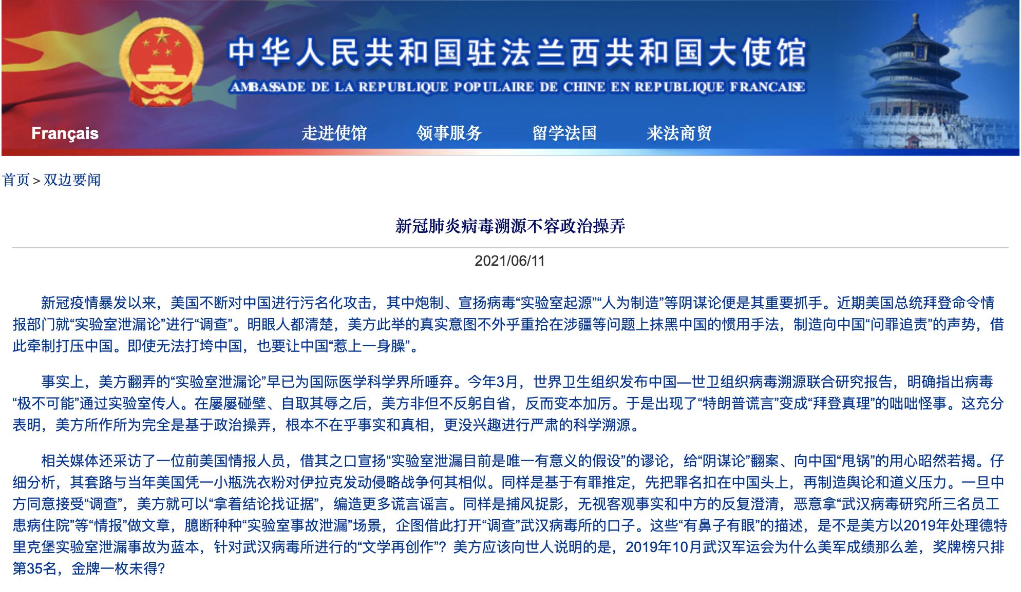 當(dāng)?shù)貢r(shí)間6月11日,中國(guó)駐法國(guó)大使館發(fā)表了題為《新冠肺炎病毒溯源不容政治操弄》的文章,全文如下: